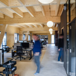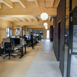 L’immeuble de bureaux clair, moderne et au design industriel peut accueillir une trentaine de collaborateurs. Le rez-de-chaussée, haut de 3,8 mètres, abrite une cuisine, un bistrot avec salon, une grande salle de réunion, un petit bureau ainsi que le local technique. L’étage supérieur, d’une superficie de près de 200 m2 et accessible par un escalier en colimaçon, se compose d’un bureau paysager et de trois petits bureaux séparés par des cloisons en verre, utilisés pour le travail concentré. Un autre petit bistrot est intégré dans l’environnement de travail lumineux et aménagé avec beaucoup de bois.